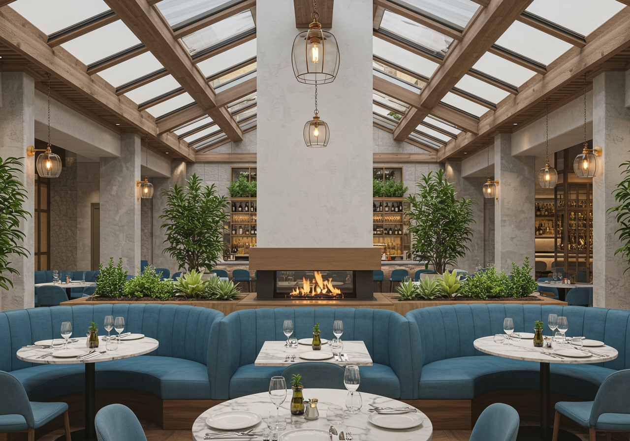 Designer Thomas Schools, a leading hospitality interior designer, took inspiration for space from coastal La Jolla living, incorporating an indoor-outdoor airy feeling along with traditional beach artifacts with a modern twist. A giant whale skeleton surrounded by a wrought-iron cage turns into a chandelier at night when industrial light bulbs that hang from the structure switch on. The 100-year old olive trees on either side warm the room and contribute natural textures and aromas to the California-cool dining area.