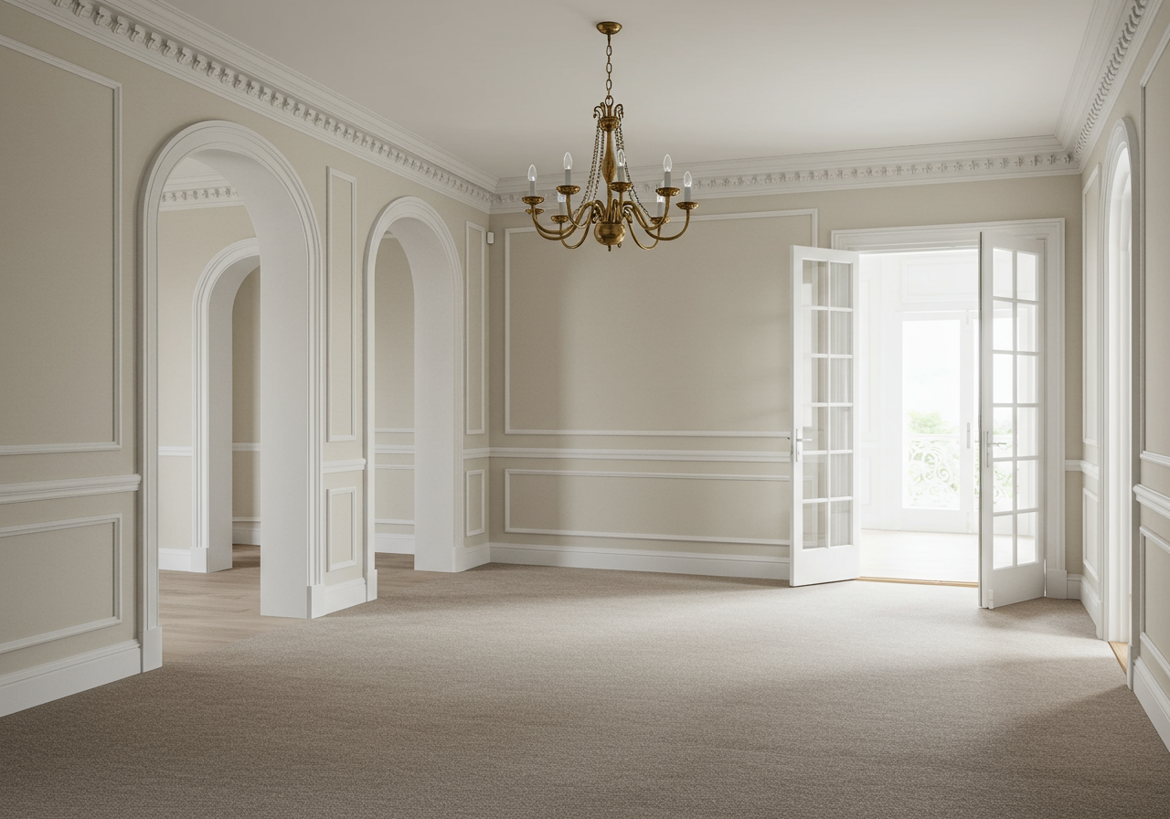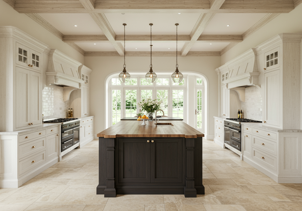 A tile roof with genoise detail and all-copper leader heads and gutters reflect authentic French design, which is very popular today. Living areas are grand in proportion, with a living and dining room area illuminated by chandeliers, and a great room with a wall of built-in shelving and slide-away Southland bifold doors leading to an oversized loggia with fireplace. An equally impressive kitchen has a lofty beamed ceiling, large breakfast room, 2 islands, 2 Shaw farmhouse sinks, white cabinetry, and top-of-the-line appliances that include 2 built-in Sub-Zero refrigerators, 2 Viking dishwashers, Viking double oven, and a Viking Professional Series dual-fuel range.
